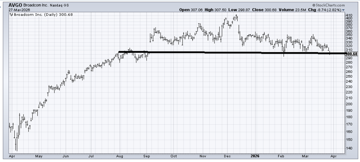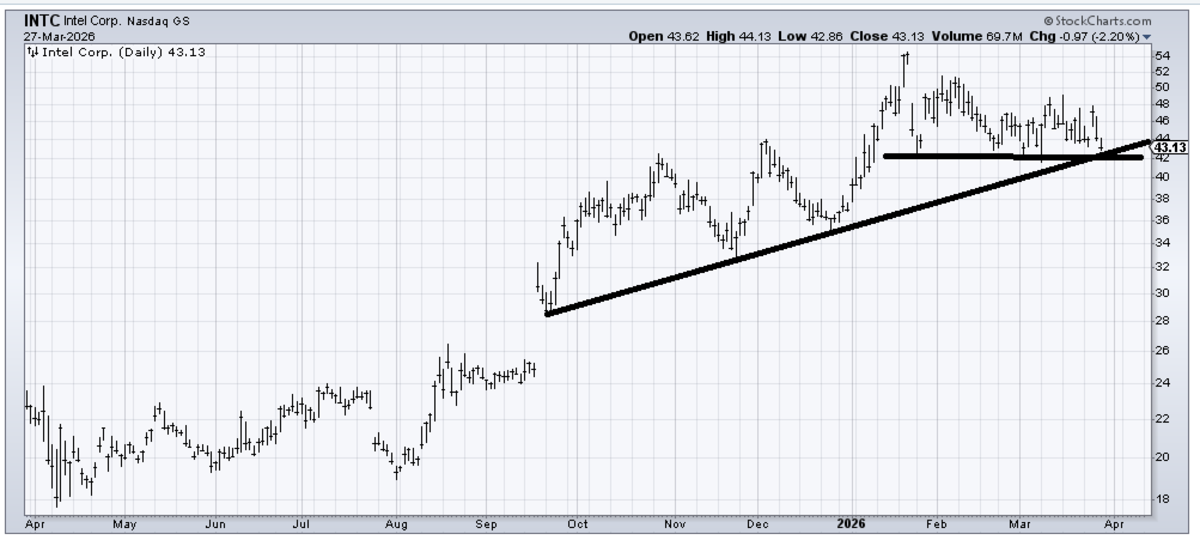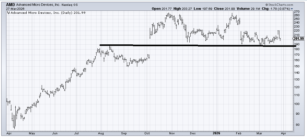 Advanced Micro Devices (AMD) is actually performing better than the other two, though it still has a breakdown looming about 15-20 points below.