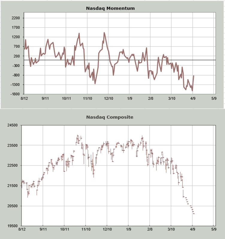 You may recall that just over a week ago, I performed a “what if” scenario for the Russell Momentum Indicator, indicating an oversold Russell but a Nasdaq that wasn’t. If that method drives the Nasdaq down roughly 1000 points over the next 10 business days, an oversold situation may arise. Interestingly, even if prices drop, the indicator can increase.
