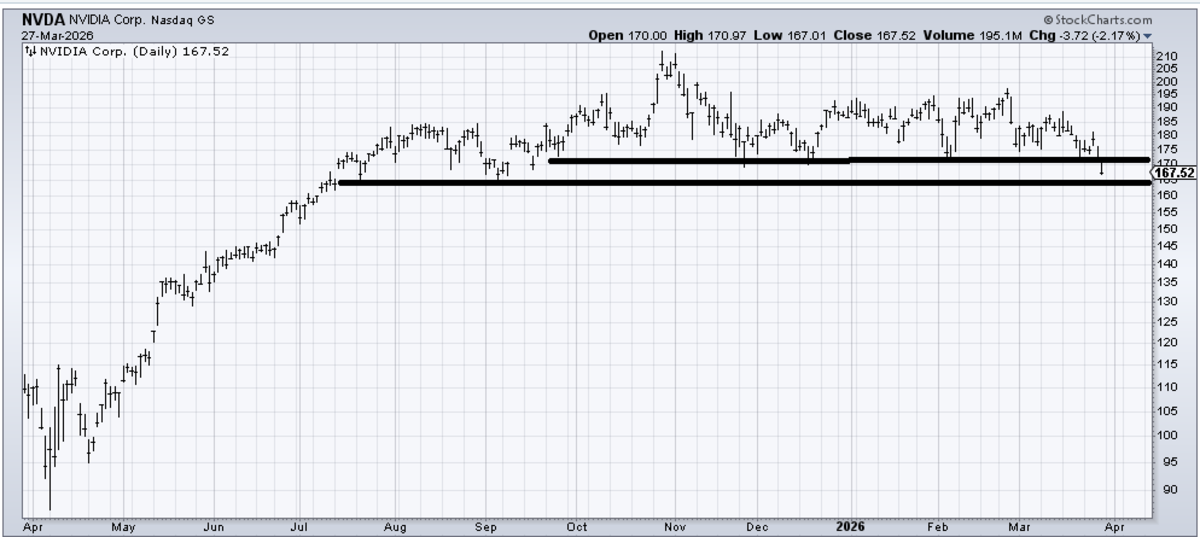 I’d like to revisit the three half-charts I’ve been tracking. Nvidia (NVDA) recently crossed 170 and found support at 165. I was expecting some excitement around the 170 mark, but it didn’t materialize.