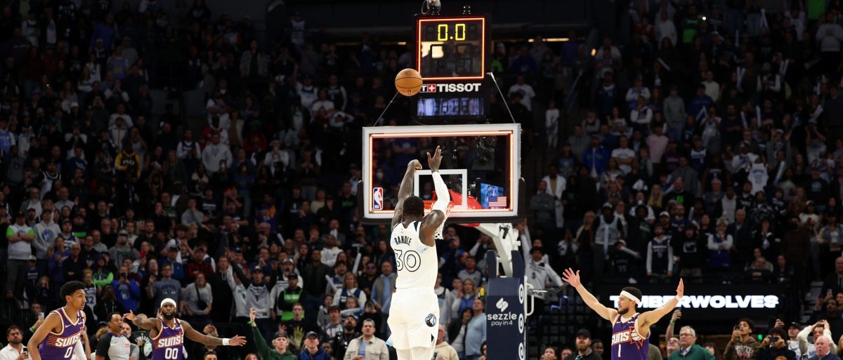 Literally the only action in this game, Timberwolves shooting guard Joe Ingles threw the ball inbounds to advance Julius Randlewho hit the basketball gods with a 3-point shot and gave us a moment usually only seen in college basketball.