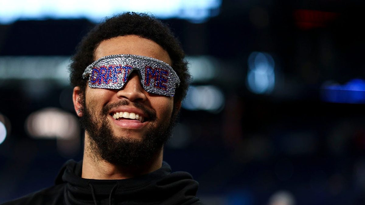 Southern California’s Caleb Williams smiles while wearing “Draft Me” sunglasses during the NFL Combine at the Indiana Convention Center on March 2, 2024 in Indianapolis. (Kevin Savitas/Getty Images)