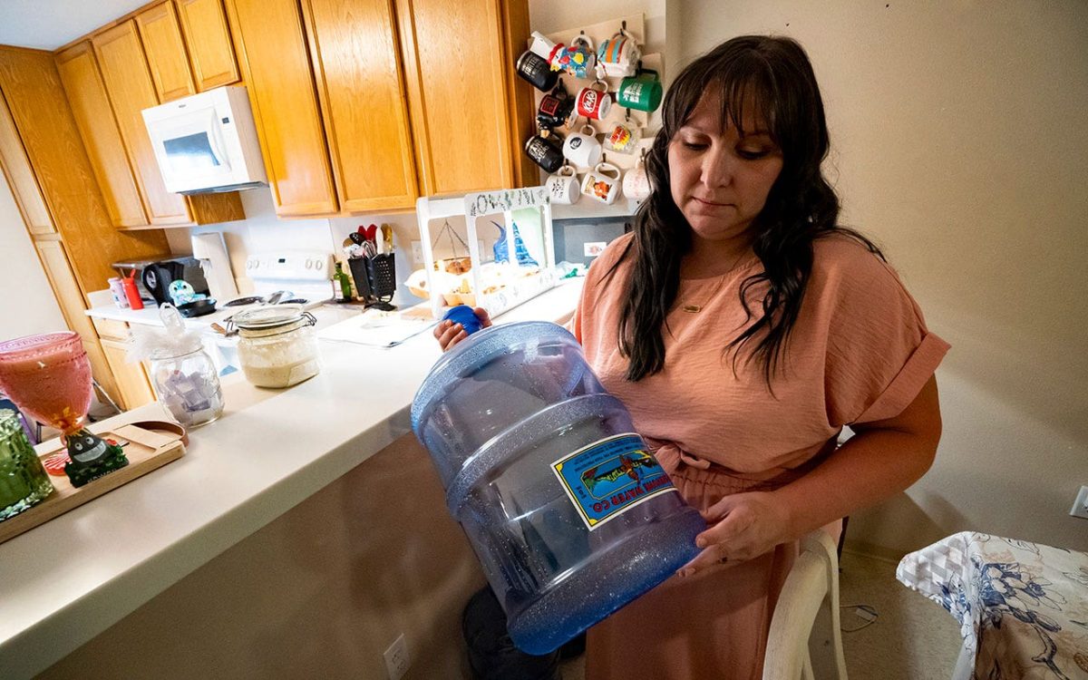 Richelle Dietz holds an empty 5-gallon water bottle at her home at Joint Base Pearl Harbor-Hickam in Honolulu, Hawaii, on April 22, 2024. The Dietz family has relied on biweekly water deliveries for her daily necessities since the water became contaminated in 2021. (AP Photo/Lin Mengxin)