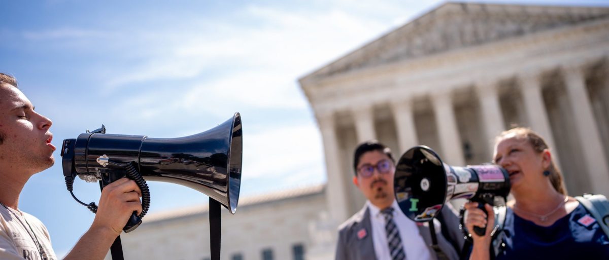 WASHINGTON, DC – JUNE 20: A pro-life supporter stands on a lamppost holding a sign that reads “Pro-Life is My Choice” in front of the Supreme Court in Washington, DC. (Photo by Andrew Harnick/Getty Images)