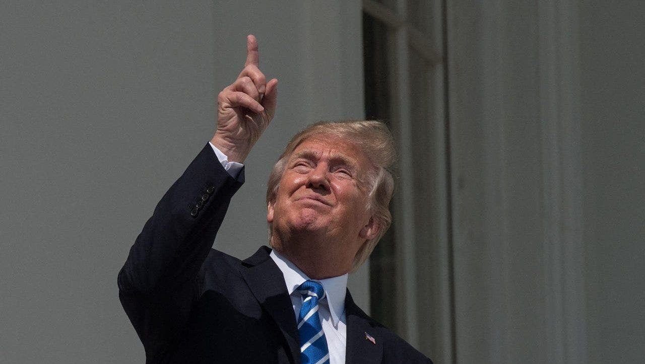 Then-President Trump looks up at the partial solar eclipse from the balcony of the White House in Washington, DC. (Nicholas Kamm/AFP via Getty Images)