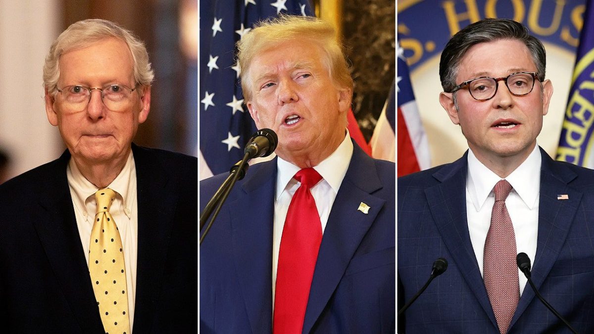 On the left is Senate Majority Leader Mitch McConnell, on the right is former President Trump, and on the left is House Speaker Mike Johnson. (Getty Images)