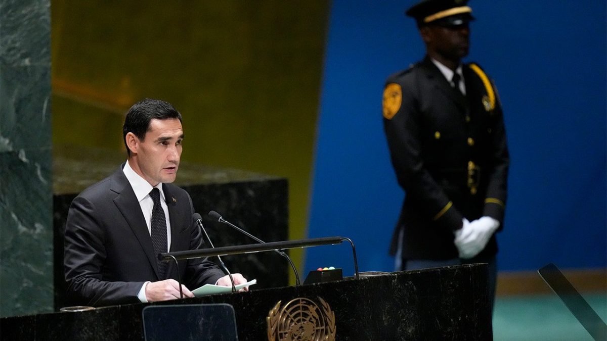 President of Turkmenistan Serdar Berdimuhamedov addresses the 78th session of the United Nations General Assembly at United Nations Headquarters, Tuesday, September 19, 2023. (AP Photo/Mary Altafer)