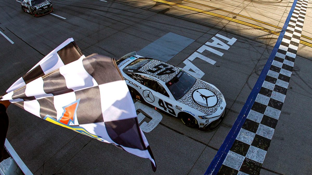 Tyler Reddick, driver of the No. 45 Jordan Brand Toyota, takes the checkered flag to win the NASCAR Cup Series Geico 500 at Talladega Superspeedway in Talladega, Alabama on April 21, 2024. . (Sean Gardner/Getty Images)
