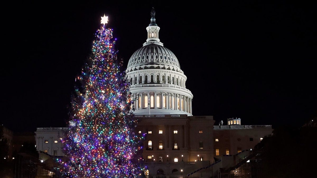 A Christmas tree is lit during a ceremony on the west front of the U.S. Capitol on December 3, 2024 in Washington, DC. (Kevin Dietsch/Getty Images)