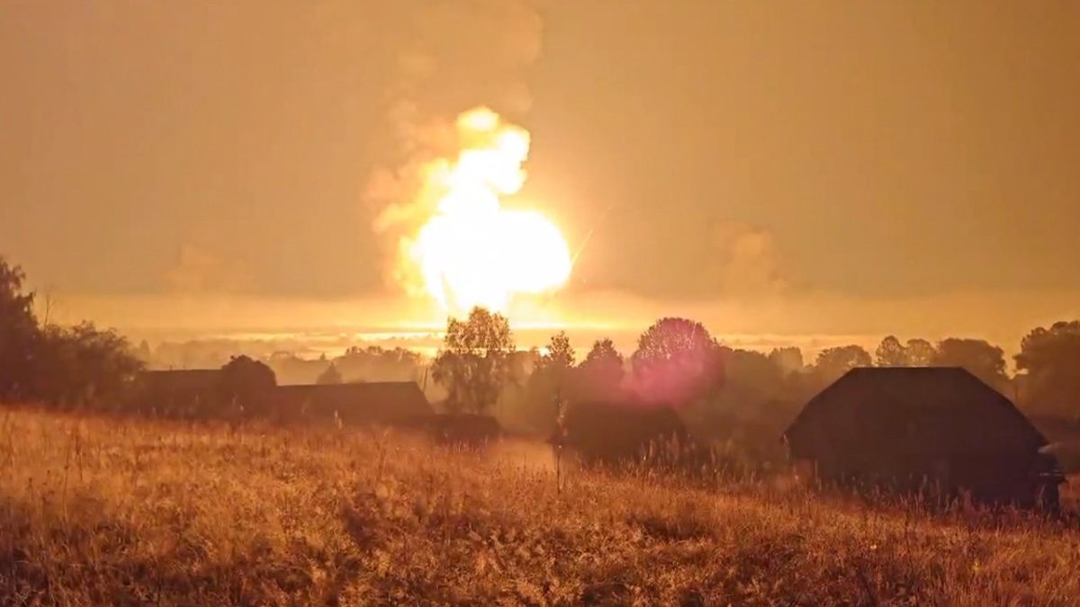 In this screenshot taken from a social media video released on September 18, 2024, an explosion and flames are seen in Toropets, Tver Oblast, Russia. (via Social Media/Reuters)