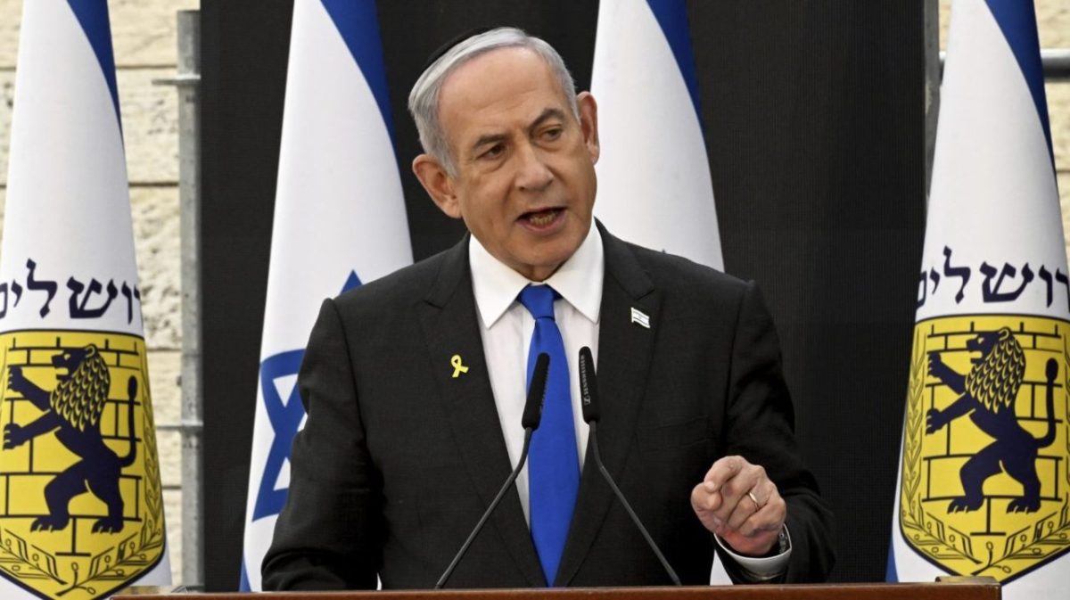 Israeli Prime Minister Benjamin Netanyahu speaks during a ceremony to commemorate Israel’s fallen soldiers in wars and victims of attacks at the Mount Herzl Military Cemetery in Jerusalem, May 13, 2024. (Gil Cohen Magen/Pool Photo via The Associated Press)