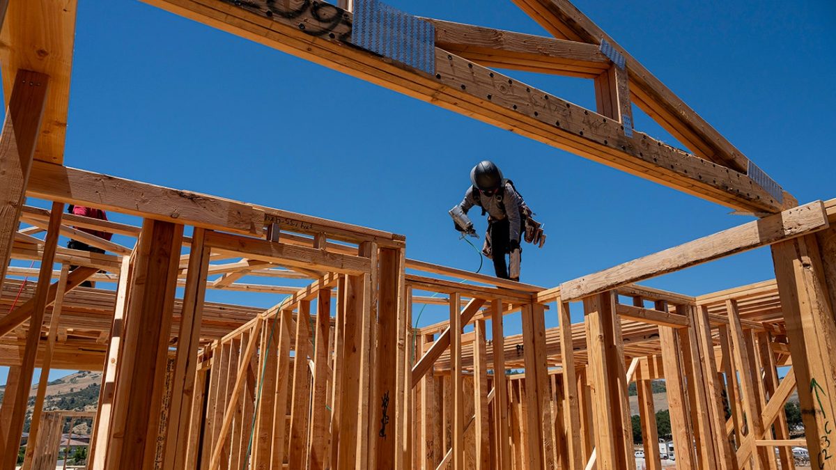Workers build a home on June 15, 2023 in Lillington, North Carolina. (Photographer: Alison Joyce/Bloomberg via Getty Images/Getty Images)