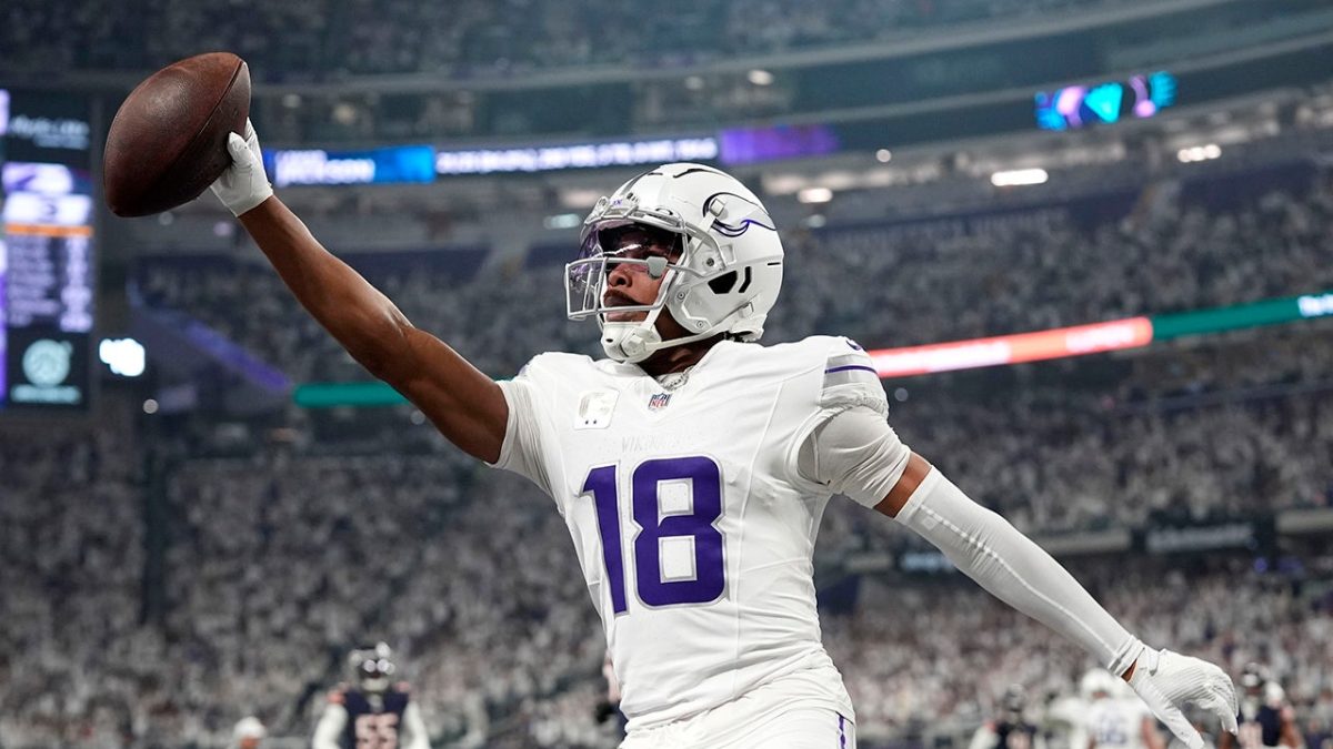 Jefferson caught his eighth touchdown pass of the season. It was a 7-yard grab from Sam Darnold. He had seven catches for 73 yards.