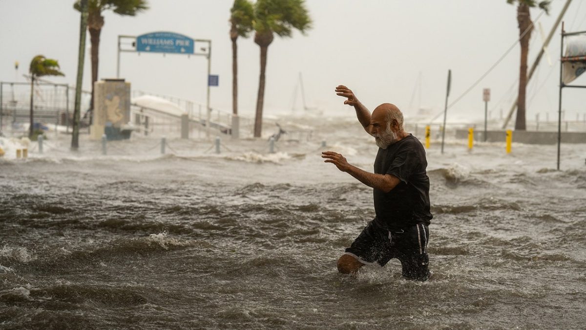 A man crosses a storm surge flooded area on the Gulfport, Florida coast as Hurricane Helen moves west through the Gulf of Mexico on September 26, 2024. (Thomas Simonetti of The Washington Post, via Getty Images)