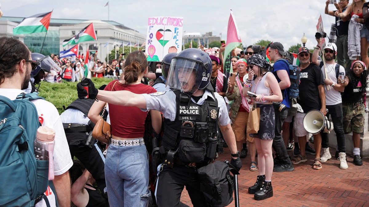 A U.S. Park Police officer aims a pepper spray canister at a demonstrator during a pro-Palestinian protest on Capitol Hill in Washington, U.S., on July 24, 2024, the day Prime Minister Netanyahu addressed a joint session of Congress. (Reuters/Seth Herold)