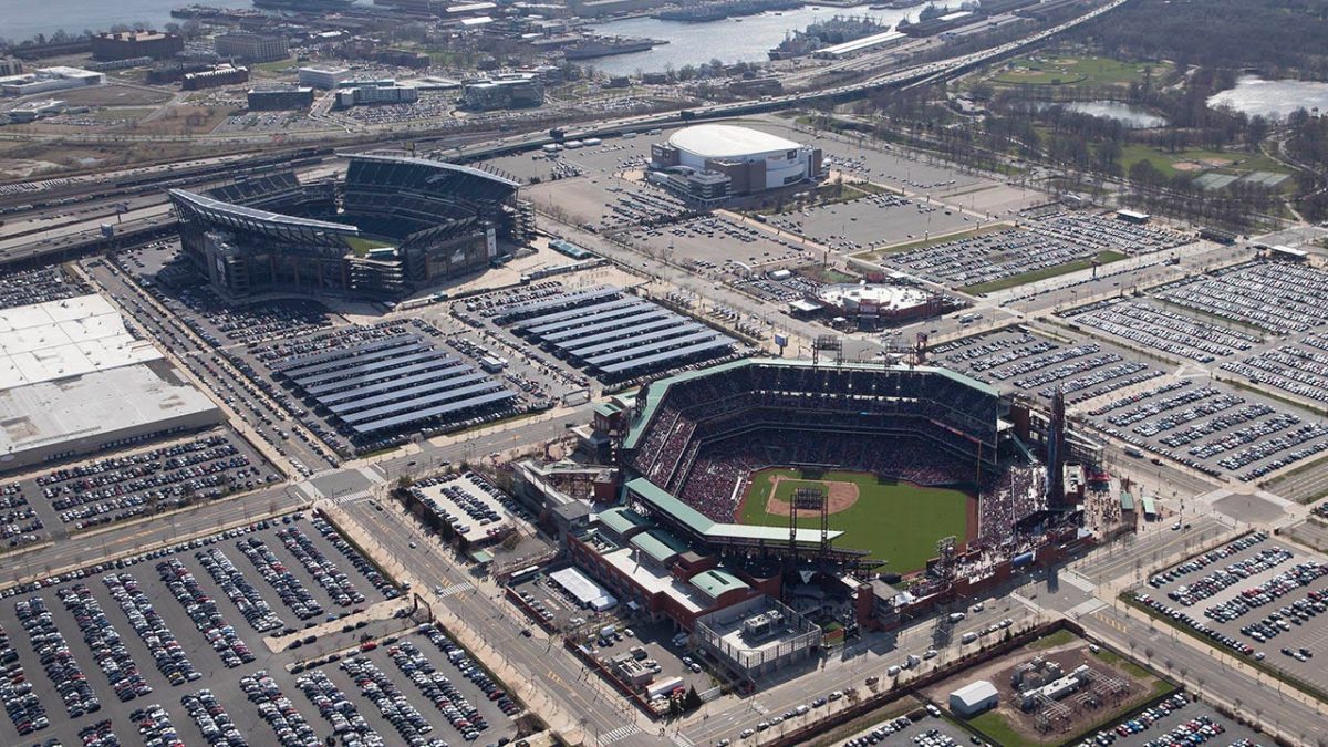 Aerial view of Citizens Bank Park, Lincoln Financial Field, and Wells Fargo Center during the Miami Marlins vs. Philadelphia Phillies game on April 5, 2018 in Philadelphia. (Mitchell Lev/Getty Images)