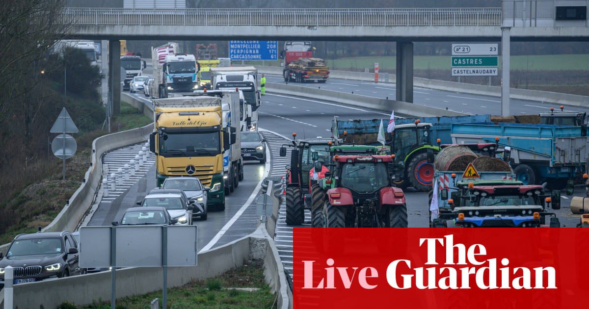 “,”elementId”:”0c3cbeee-8968-41a3-bd25-e047ad467e4b”}],”attributes”:{“pinned”:false,”keyEvent”:true,”summary”:false},”blockCreatedOn”:1706009139000,”blockCreatedOnDisplay”:”06.25 EST”,”blockLastUpdated”:1706013522000,”blockLastUpdatedDisplay”: “07.38 EST”,”blockFirstPublished”:1706009372000,”blockFirstPublishedDisplay”:”06.29 EST”,”blockFirstPublishedDisplayNoTimezone”:”06.29″,”title”:”14-year-old dies after French farmers protest”,”contributors” :[],”primaryDateLine”:”Tuesday 23 January 2024 07.38 EST”,”secondaryDateLine”:”First published Tuesday 23 January 2024 04.45 EST”},{“id”:”65af8b678f0835e980a41ee5″,”elements”:[{“_type”:”model.dotcomrendering.pageElements.TextBlockElement”,”html”:”