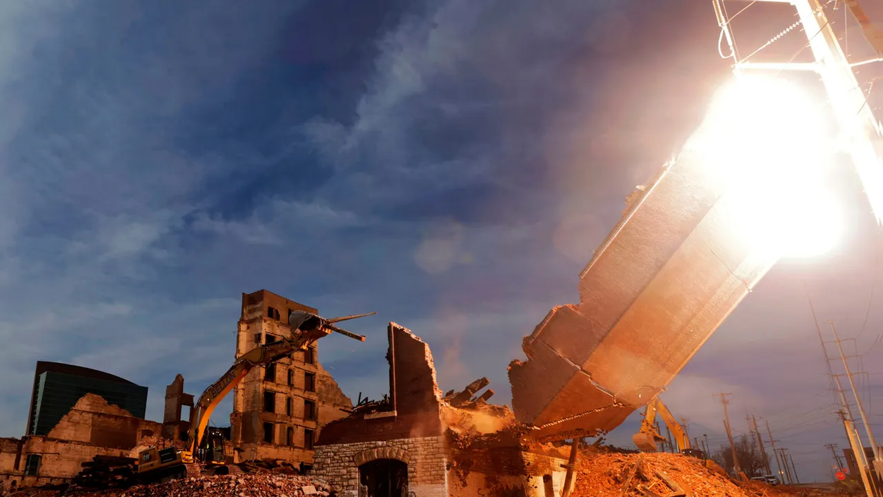 On Friday, demolition workers demolishing a burned-out St. Louis factory accidentally slammed a brick wall into a power tower, causing a brief explosion that flickered power to some downtown buildings.