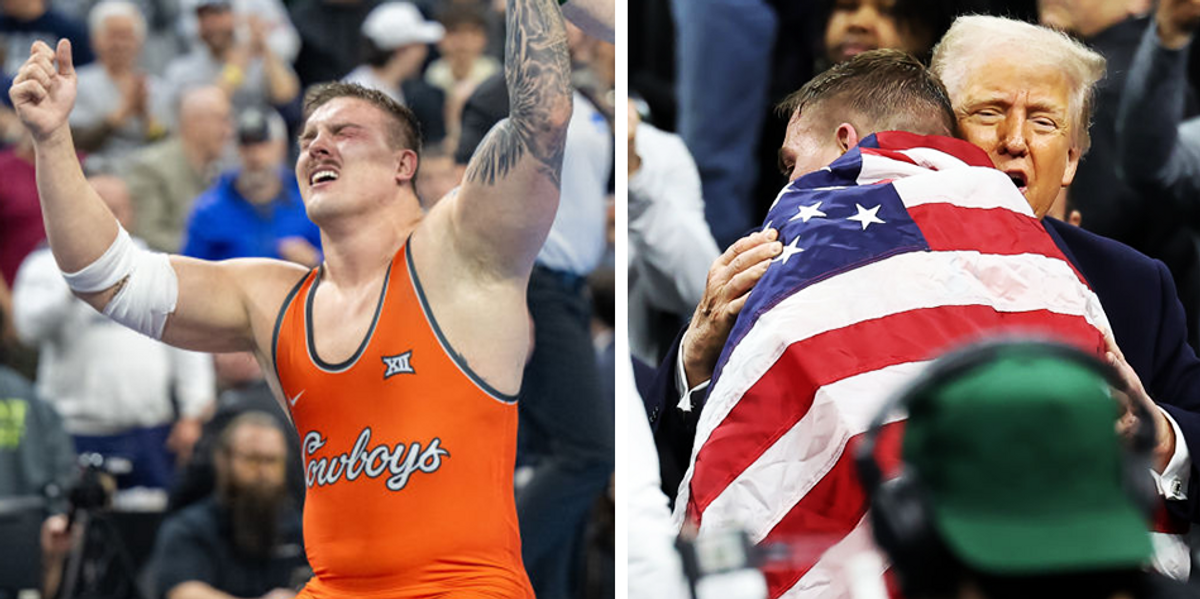 Oklahoma State wrestler Wyatt Hendrickson salutes and embraced the US president after a shocking, upset victory at the NCAA Championship.